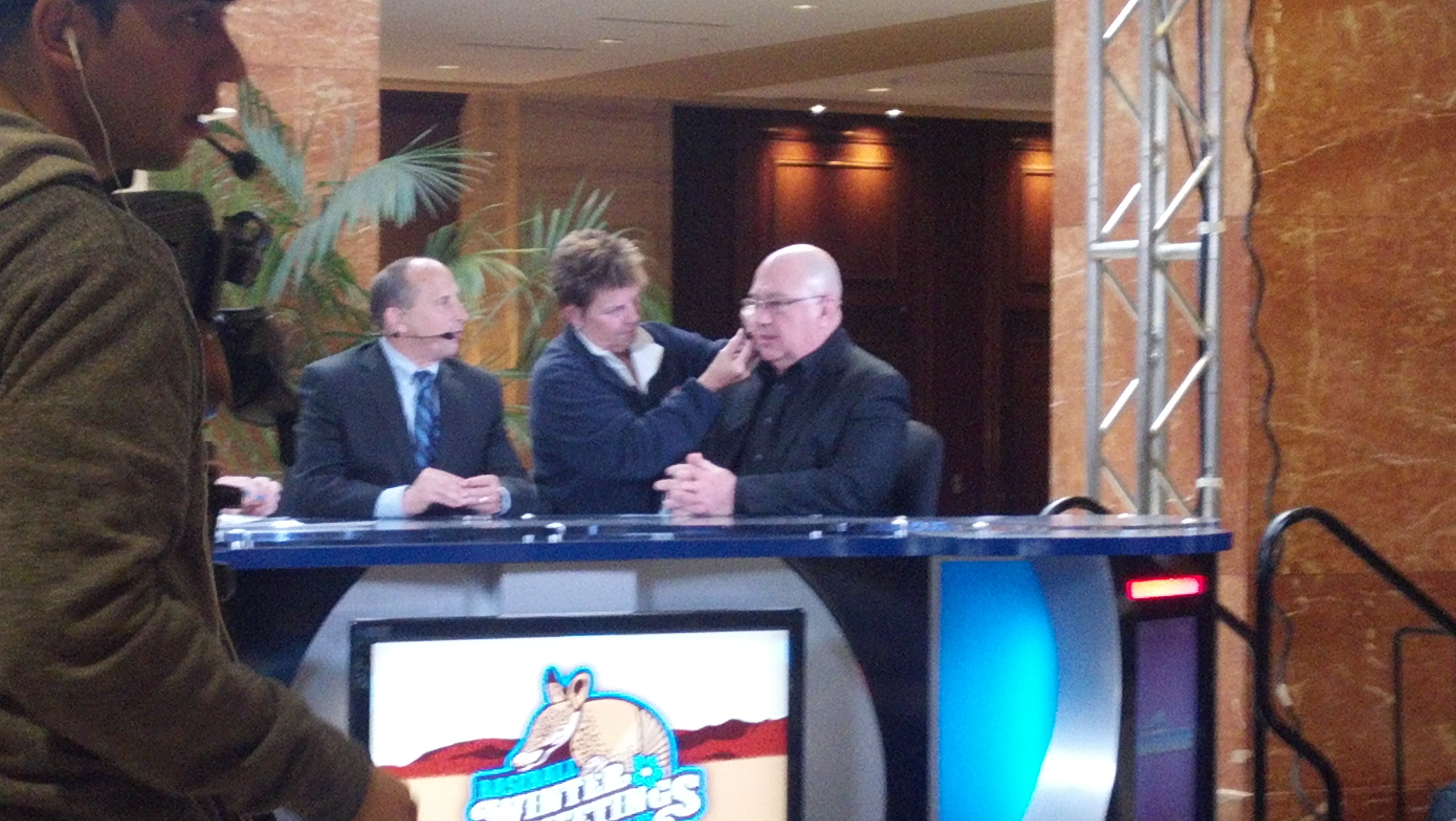 Walking from meeting to meeting it was amazing looking to your right and seeing Peter Gammons in a deep conversation with Jim Leyland, or looking to your right and seeing a hoard of media following Marlins owner Jeffrey Loria. Watching Frank Robinson check into the hotel and then see Tommy Lasorda walk up to say hello to him. Every person in baseball is there. Every GM, every manager at some point as well. Every media person that follows baseball attends. I caught FOX’s Ken Rosenthal huddled in a corner charging his blackberry. Had a chance to catch up with Buster Olney who actually joined me during the Southern League All-Star Game broadcast this year and spoke at the luncheon.