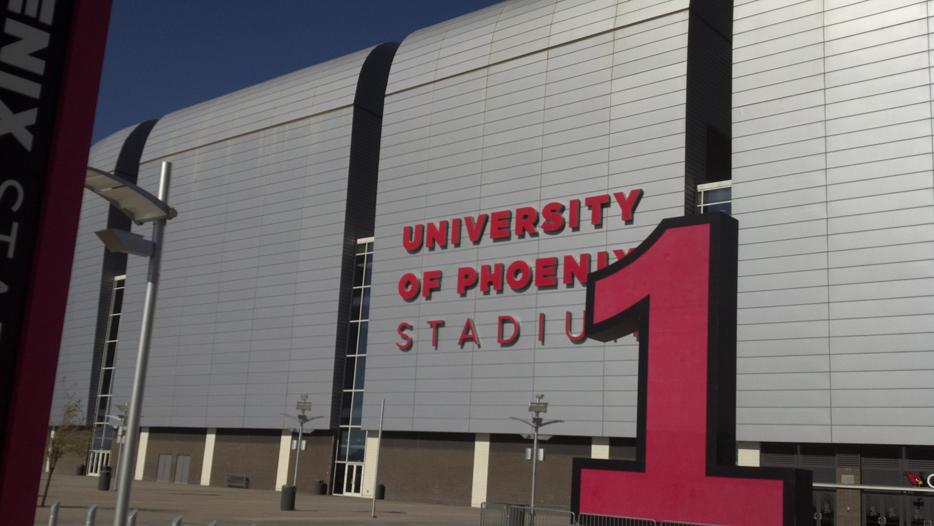 Arrived around 2:30 Arizona time and got the rental car with no problem. (I know that probably burns Mike Curto up). The drive from Phoenix to Peoria is about 30 minutes and along the way you go through Glendale. University of Phoenix Stadium, home of the Arizona Cardinals and Fiesta Bowl was on the right and looked like a huge space ship. I am sucker to just stop at random stadiums so we did.