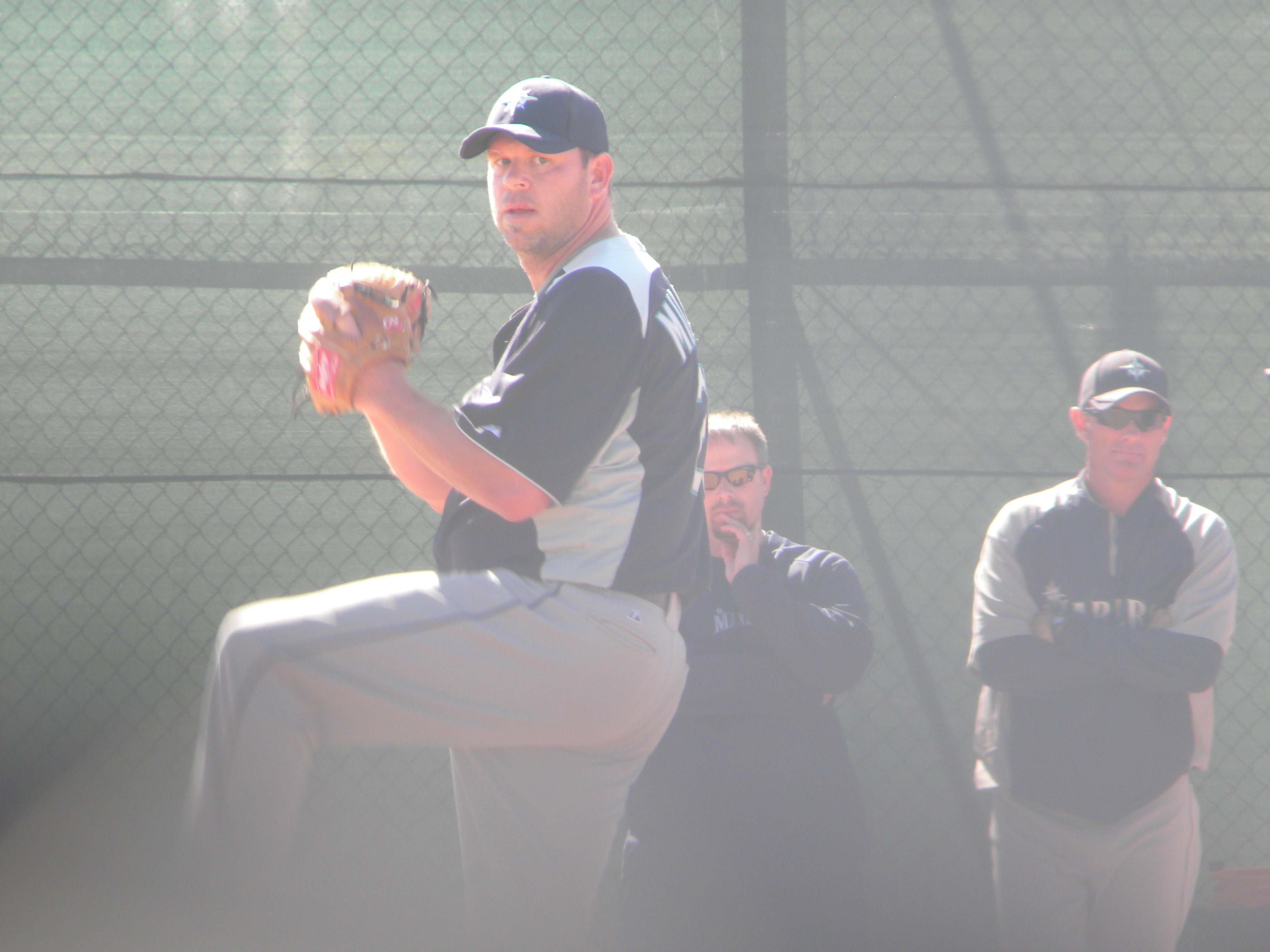 The major league guys trickled in throughout the morning. The three-bus caravan of Mariners and staff left for the airport around 12:15pm. Each Mariner player was allowed to bring one guest on the team flight. Kevin Millwood did not make the trip because he is not scheduled to pitch in any of the games. As you see below, today he tossed a bullpen session around the minor league pitchers on a back field. The whole Japan trip is very confusing. The M’s trimmed their roster to 30 , but only 25 can be eligible for the two regular season games with the Athletics. When they return to Peoria, after reassigning or optioning guys to minor league camp, they can bring them back to play the final five Cactus League games. Told you it was confusing. The Japan trip has made things a bit more chaotic than usual I’ve heard from several people.