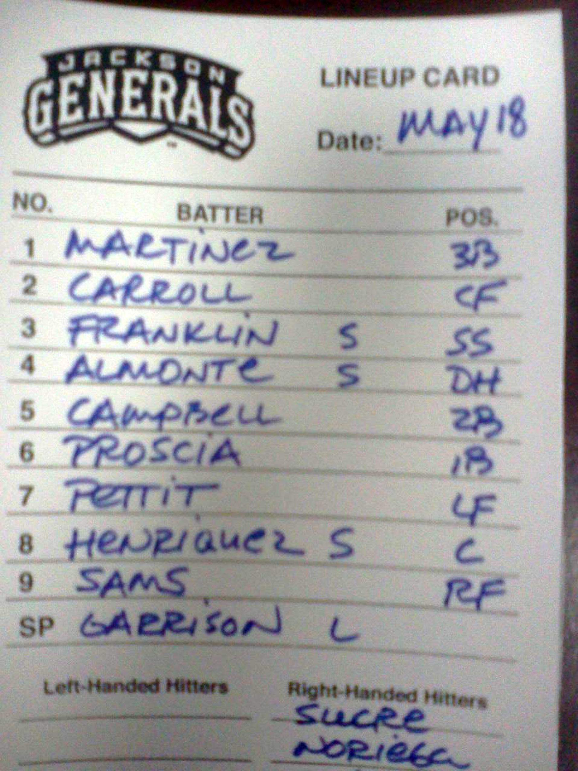 TODAY’S GAME:The 1st place Generals play game 2 of the 5-game series against Mobile tonight at Pringles Park, with first pitch at 7:05. The Generals and BayBears are tied for the best record in the Southern League at 24-17.