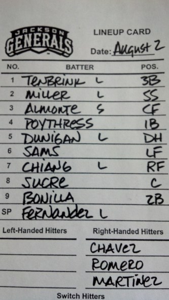 TODAY’S GAME: The Generals play the rubber match of the 5-game series against the Birmingham Barons (CHW) tonight at Regions Park. Jackson will look to snap a short 2 series losing skid. This is the lone visit Jackson pays to Birmingham. The Generals took 4 of 5 from the Barons, April 5-9 at Pringles Park to open the 2012 season.