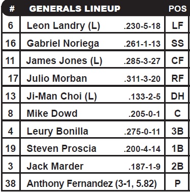 TODAY’S GAME: the Generals play the rubber game a 5-game series at The Ballpark in Jackson against the Chattanooga Lookouts (LAD) (2-2)…the Generals lead the season series, 5-4… 22-year-old Anthony Fernandez makes his 8th start of the year vs. Chattanooga in game 5 of the series…began the season on DL and made first start on 4/29 at CHA…in 2 career starts vs. CHA Fernandez is 0-1 with 8.75 ERA.