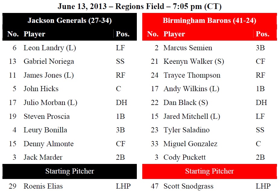 TODAY’S GAME: the Generals open a 5-game road series against the SL North 1st half Champion Birmingham Barons…the Barons’ 41 wins is the most in the league…Jackson leads the season series 3-2 and will meet Birmingham 15 times in 2013…24-year-old Roenis Elias makes his 12th start for the Generals in the opener of the series at Birmingham. This is his 46th overall start in his pro career.