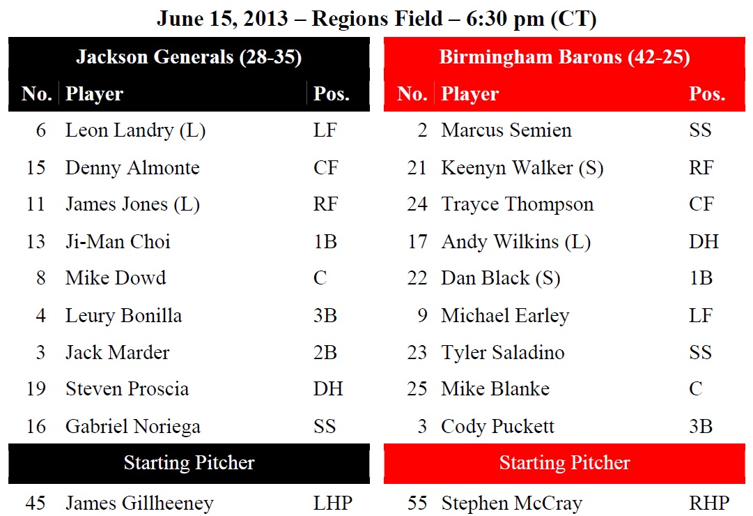 TODAY’S GAME: the Generals play the middle game of a 5-game road series against the SL North 1st half Champion Birmingham Barons with game #3 of the series (1-1)…the Barons’ 42 wins is the most in the league…Jackson leads the season series 4-3 and will meet Birmingham 15 times in 2013… 25-year-old lefty James Gillheeney starts for Jackson…this is his 11th start of the season and 6th for Jackson…this is his 2nd career start against the Barons…last on 8/7/11 at Hoover…took no decision in 6 innings allowing 2 runs on 4 hits striking out 3 and walking 3.