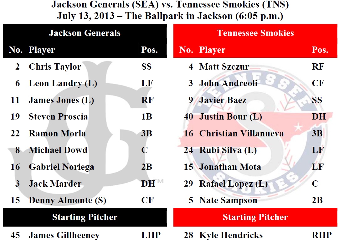 Game #90: Jackson Generals (10-13, 39-50) vs. Tennessee Smokies (15-8, 49-43)