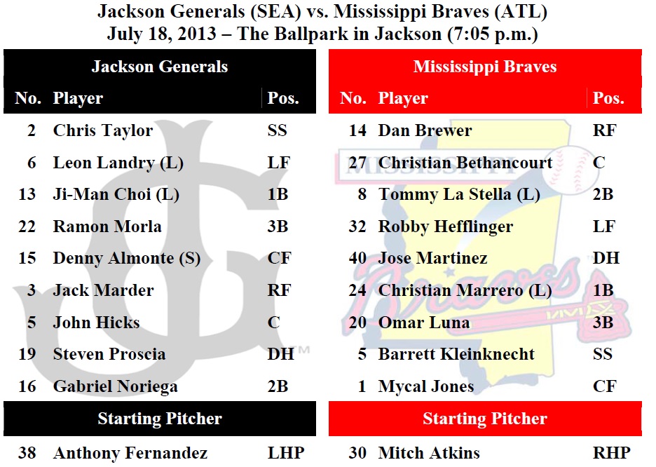 Game #90: Jackson Generals (10-14, 39-51) vs. Mississippi Braves (12-13, 50-45)
