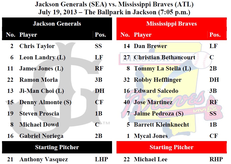 TODAY’S GAME: the Generals continue their 10-game homestand (1-5) tonight with game #2 of the 5-game series with the Mississippi Braves at The Ballpark in Jackson…this is the M-Braves’ first and only visit to Jackson this season. The Braves lead the season series 4-2 while Jackson leads the all-time series 83-82… 26-year-old LHP Anthony Vasquez makes his 5th Jackson start of the season and 8th overall in game 2. In 3 starts so far in July, Vasquez is 1-0, with a 0.95 ERA, holding opponents to a .145 average.