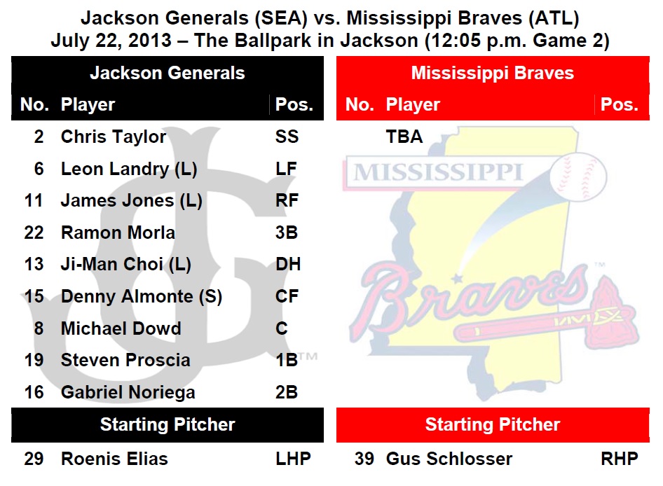 TODAY’S GAME: the Generals conclude their 10-game homestand (2-6) today with a doubleheader to close the series with the Mississippi Braves at The Ballpark in Jackson…this is the M-Braves’ first and only visit to Jackson this season. The Braves lead the season series 5-3 while Jackson leads the all-time series 84-83…25-year-old LHP James Gillheeney starts game 1 of the DH while ….This is his 4th career start vs. MIS and is 0-3 with a 8.84 ERA in those games in 2010, 2011 and 2012… 24-year-old LHP Roenis Elias makes his 18th start for the Generals in game 2. Elias is 1-6 with a 3.93 ERA at home as opposed to 4-2 with a 1.78 ERA on the road.