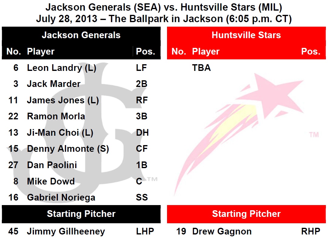 TODAY’S GAME: the Generals begin a 5-game home series tonight with game #1 of the series against the Huntsville Stars…the Generals are 4-4 against the Stars this season and 1-2 at The Ballpark in Jackson against the Brewers AA affiliate…the Generals have won 3 of 4 series’ coming in and are 5-3 since the All-Star break… 25-year-old LHP James Gillheeney starts the series opener tonigh…this is his 106th career start and 3rd against Huntsville. Gillheeney made 2 starts in 2011 against HVL and was 0-1 with a 10.80 ERA.