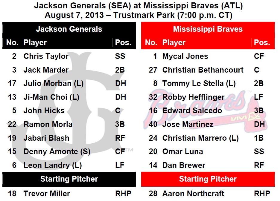 TODAY’S GAME: the Generals continue their 10-game road trip (1-2) with game #1 of a 7-game series in 5 days at the Mississippi Braves (0-0)…the Generals have won 5 of their last 7 series’ and are 9-7 since the All-Star break…Jackson is 3-5 against Mississippi this season and are 1-4 at Trustmark Park this season.