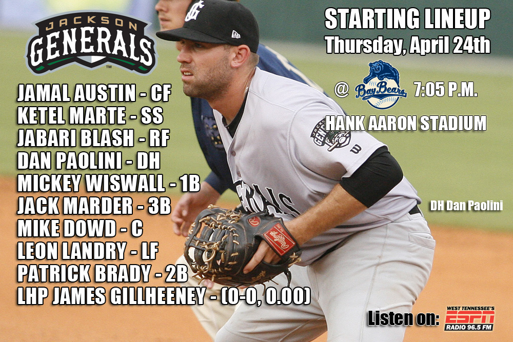 • The game can be heard on 96.5 ESPN in West Tennessee, jacksongeneralsbaseball.com and TuneIn Radio.