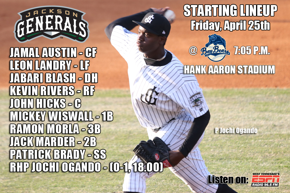 Game #22: Jackson Generals (11-10) at Mobile BayBears (12-9) | 7:05 pm | Hank Aaron Stadium