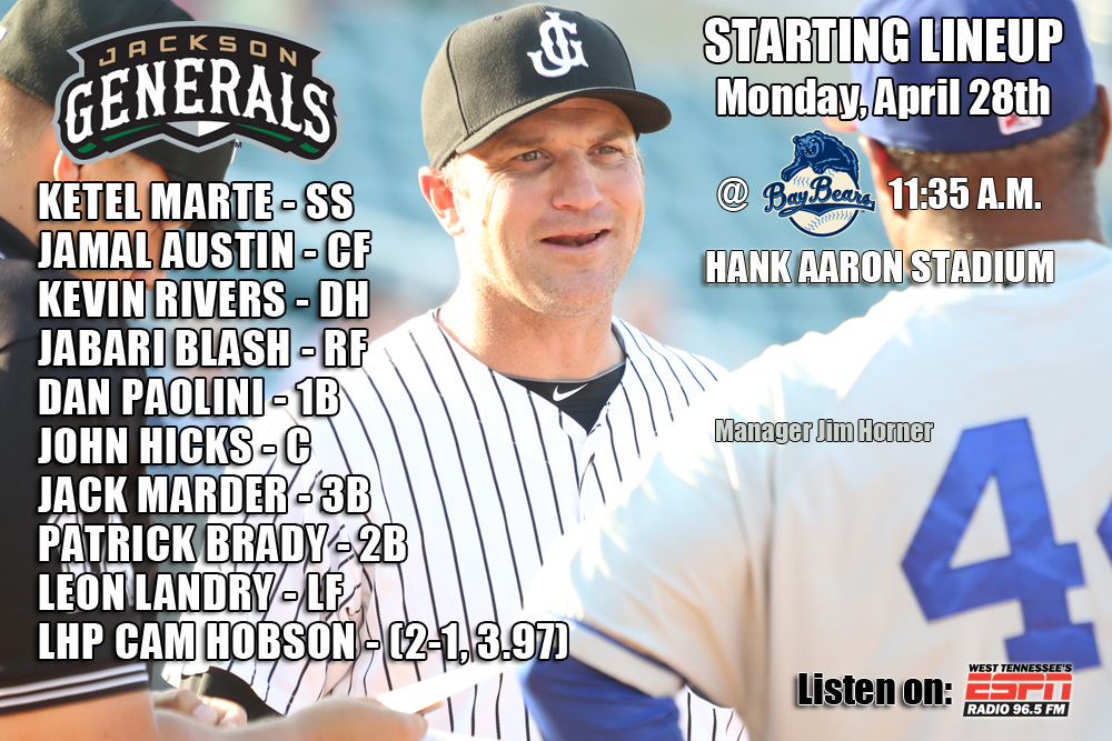 • The game can be heard on 96.5 ESPN, online at jacksongeneralsbaseball.com or TuneIn Radio.