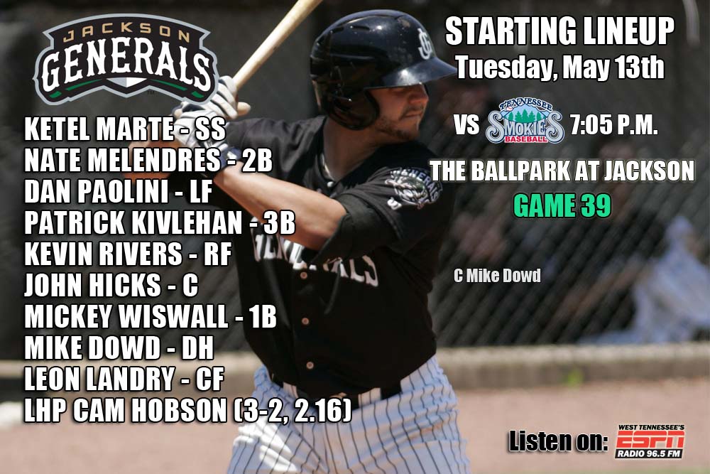 • The game can be heard on 96.5 ESPN, online at jacksongeneralsbaseball.com or TuneIn Radio.
