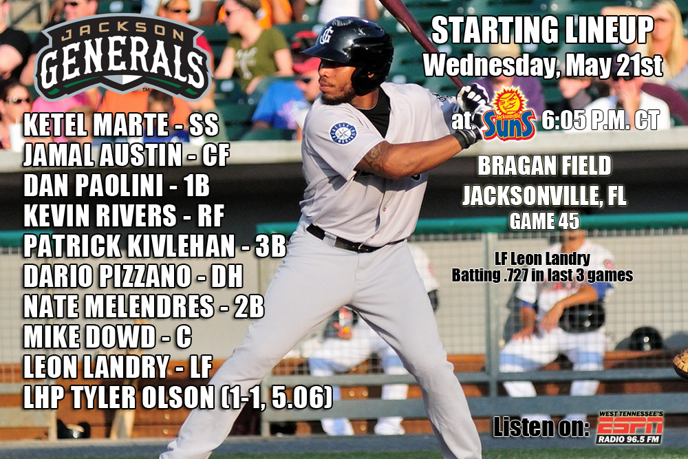 • The game can be heard on 96.5 ESPN, online at jacksongeneralsbaseball.com or TuneIn Radio.