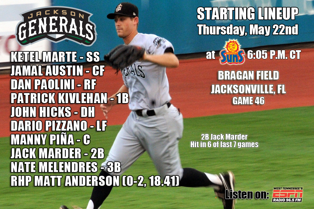 • The game can be heard on 96.5 ESPN, online at jacksongeneralsbaseball.com or TuneIn Radio.