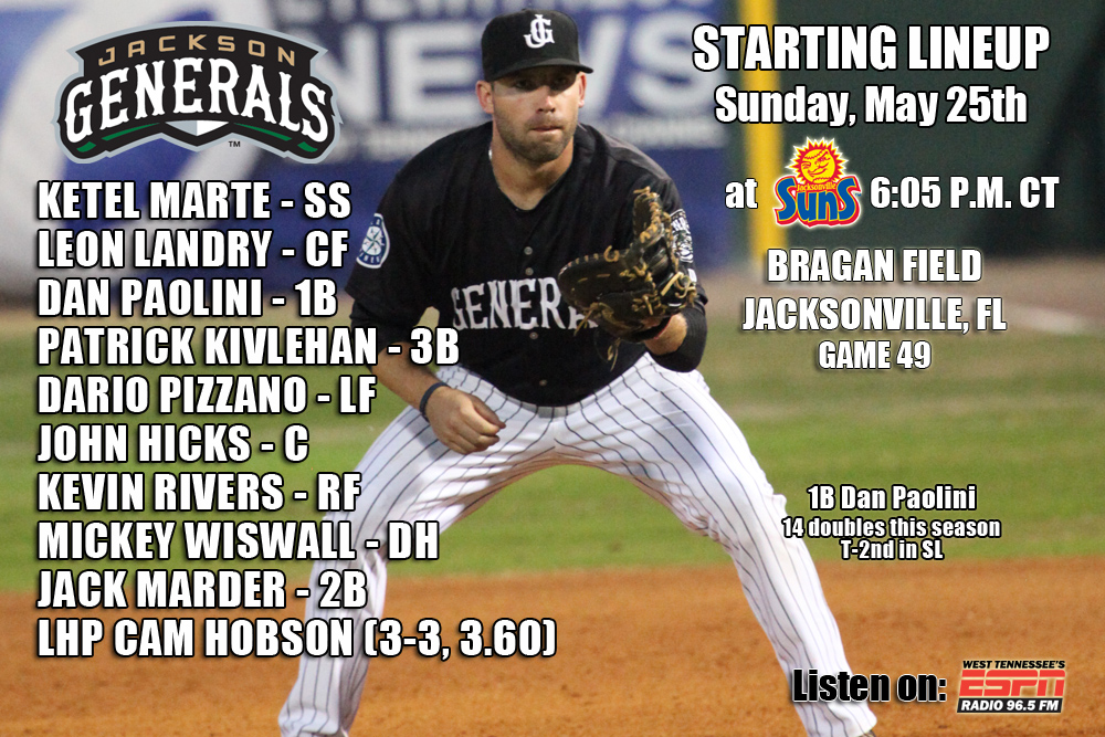 • The game can be heard on 96.5 ESPN, online at jacksongeneralsbaseball.com or TuneIn Radio.
